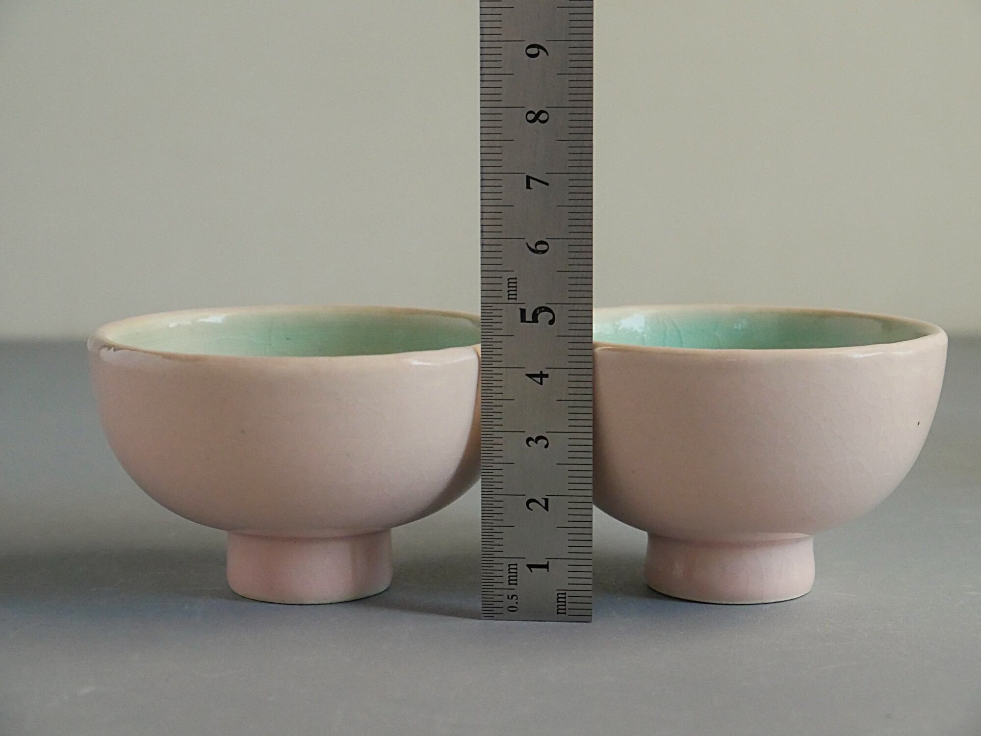 ピンク色と水色の釉を掛け分けたお猪口